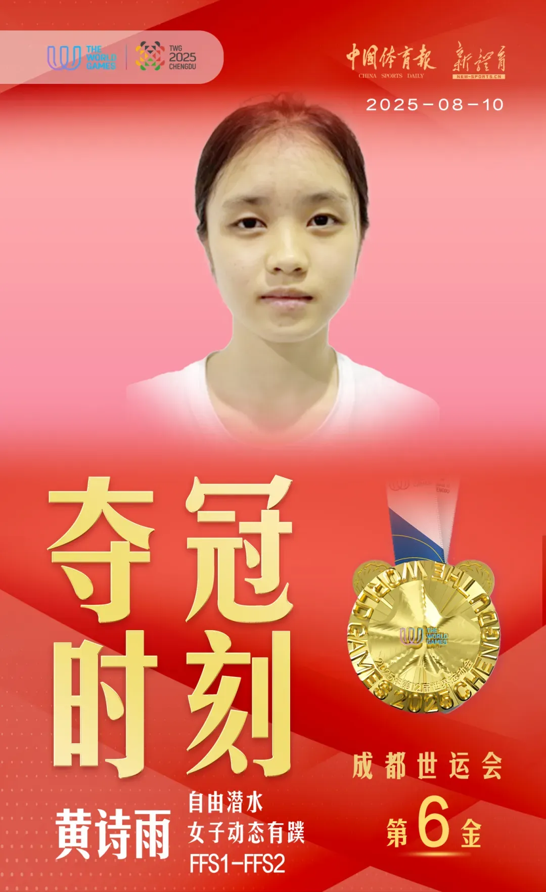 自由潜水女子动态有蹼 FFS1-FFS2 决赛中,黄诗雨以149.5米的成绩摘得金牌,并打破该项目世界纪录,助力中国代表团收获第六金。