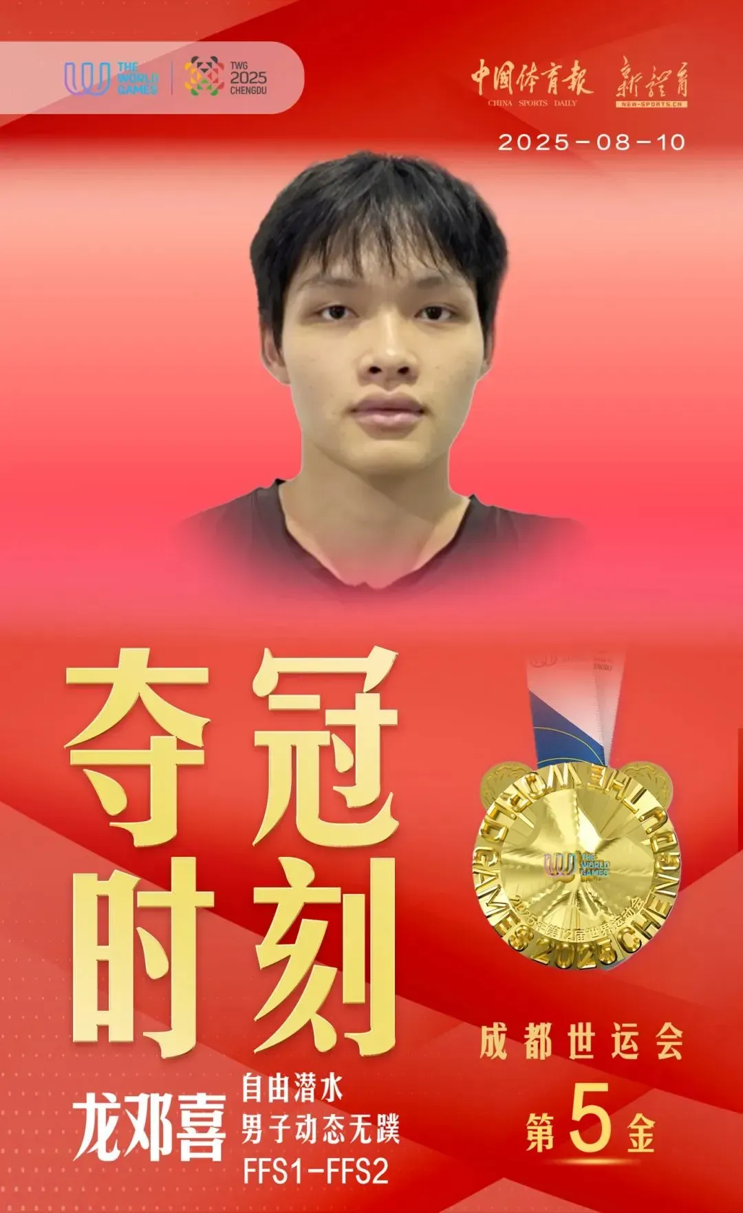 自由潜水男子动态无蹼 FFS1-FFS2 决赛中,龙邓喜以134.5米的成绩斩获金牌,打破了该项目世界纪录,为中国代表团夺下本届赛事第五金。