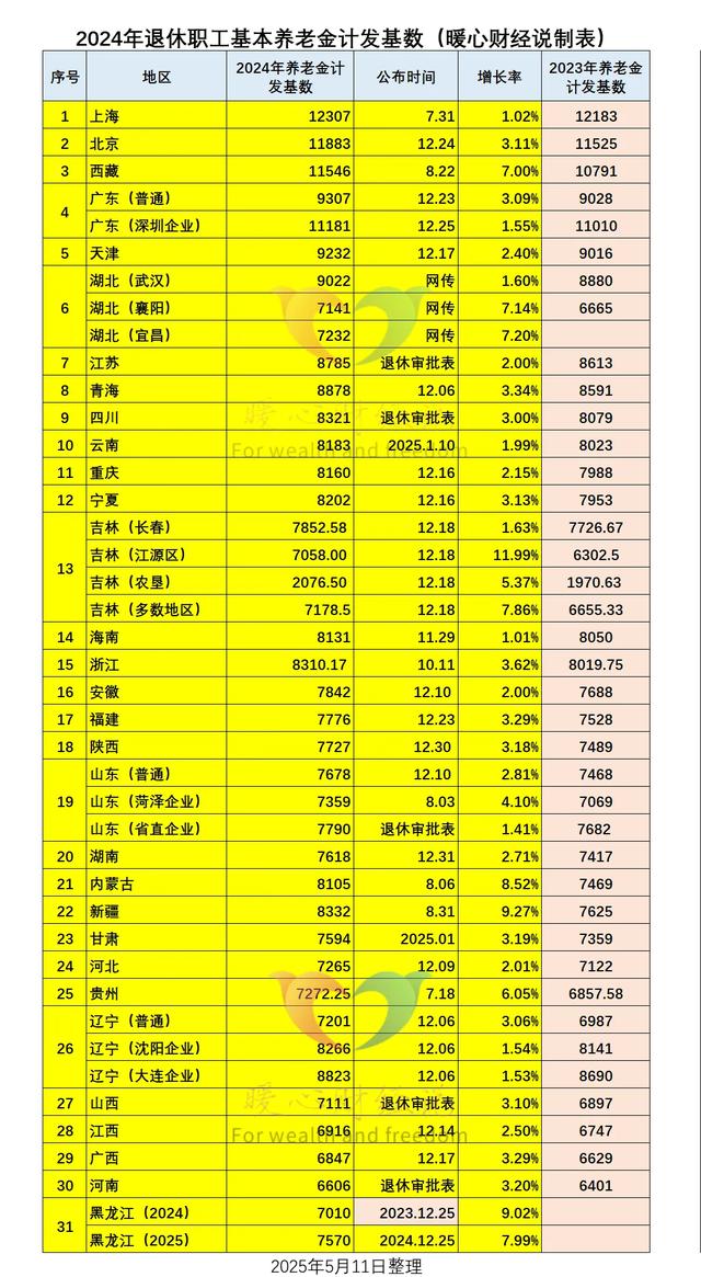2024年各地的养老金计发基数从6606元至12307元,如果计发基数是8000元左右,上面的情况基础养老金可以领取2880元/月。